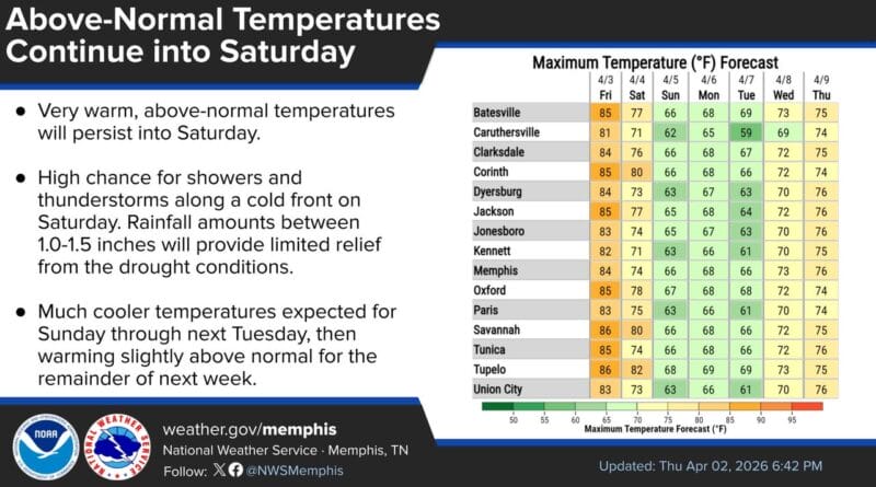 Above-normal temperatures are expected to continue into Saturday, according to weather forecasts. There is a high chance of showers and thunderstorms along a cold front that day, which could bring some relief from ongoing drought conditions, the National Weather Service said.