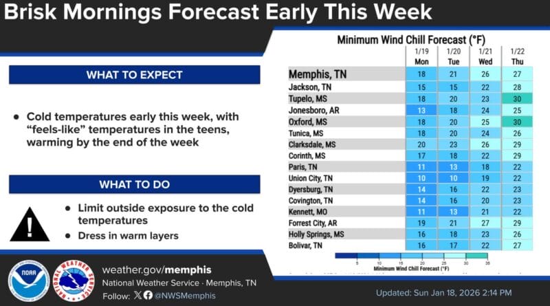 Pontotoc News Chilly mornings persist this week with temperatures in the teens, warming by midweek January 18, 2026 Jon Myers Early morning Source: Original Article