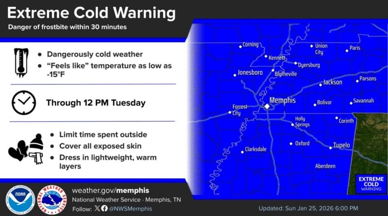The National Weather Service in Memphis has issued an extreme cold warning that remains in effect until noon Tuesday, urging residents to prepare for dangerously low temperatures.