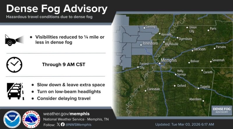 A dense fog advisory has been issued for parts of Northeast Arkansas, including the Jonesboro area, according to the National Weather Service.