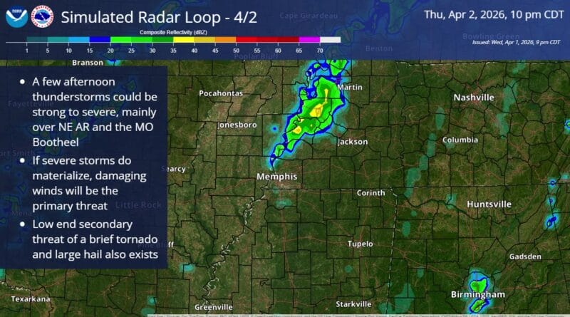 A simulated radar loop indicates a potential weather pattern for tomorrow, with a low chance of strong to severe storms during the afternoon and early evening hours, according to meteorologists.