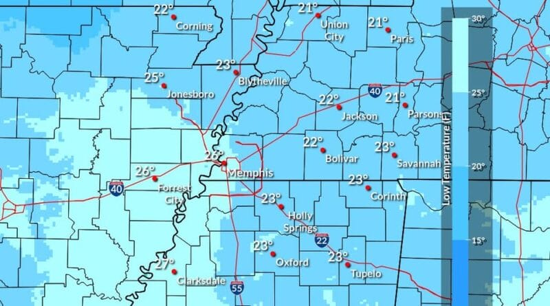 The National Weather Service in Memphis, Tennessee, has issued a freeze warning for the entire Mid-South region. Temperatures are forecast to drop into the 20s tonight into Tuesday morning.
