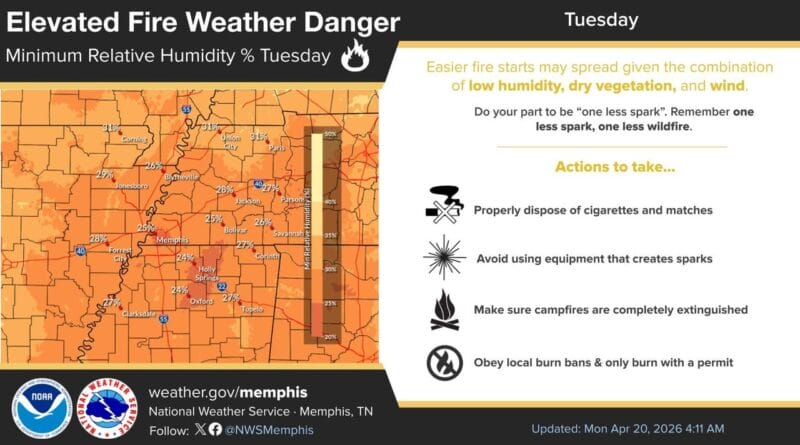 Forecasters predict a high risk of fire spread across the region on Tuesday. Elevated winds, low humidity levels between 25% and 30%, and daytime temperatures in the 80s will create ideal conditions for wildfires, according to the National Weather Service.