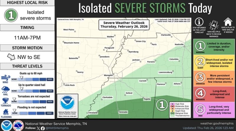 Isolated thunderstorms are expected to develop mainly south of the Tennessee-Mississippi state line beginning in the late morning, according to weather forecasts.