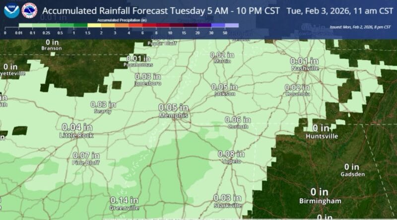 Rainfall is expected to be steady and light across the Mid-South on Tuesday, with temperatures remaining in the 40s, according to weather forecasts.