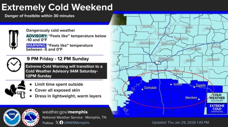 The National Weather Service in Memphis, Tennessee, has issued multiple cold weather alerts for the region. An Extreme Cold Warning will be in effect from 9 p.m. Friday to 9 a.m. Saturday, according to the agency.