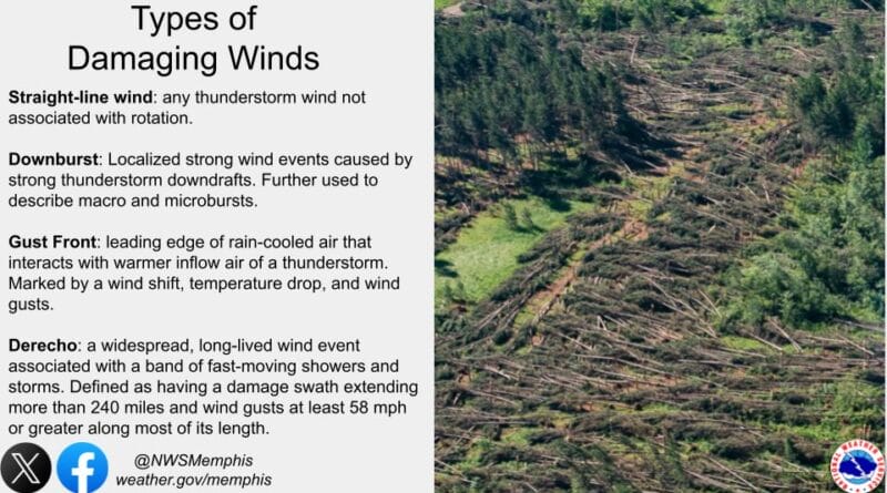 The National Weather Service in Memphis, Tennessee, has issued a warning about the potential for damaging winds during thunderstorms. Wind speeds may exceed 100 mph, posing risks to power lines, trees, and objects in the area.