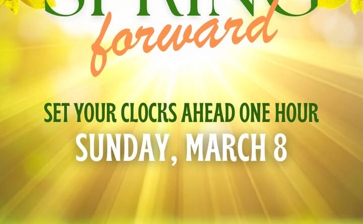 People are reminded to set their clocks ahead one hour this Sunday, March 8, as daylight saving time begins.
