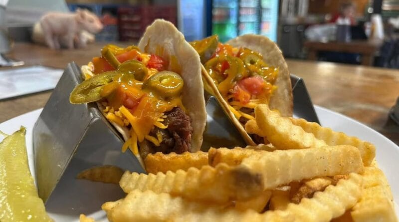 A restaurant is offering a lunchtime special this Wednesday featuring two smoked steak soft tacos. The tacos are topped with lettuce, tomatoes, jalapeƱos, cheese, and the establishment’s gold sauce.
