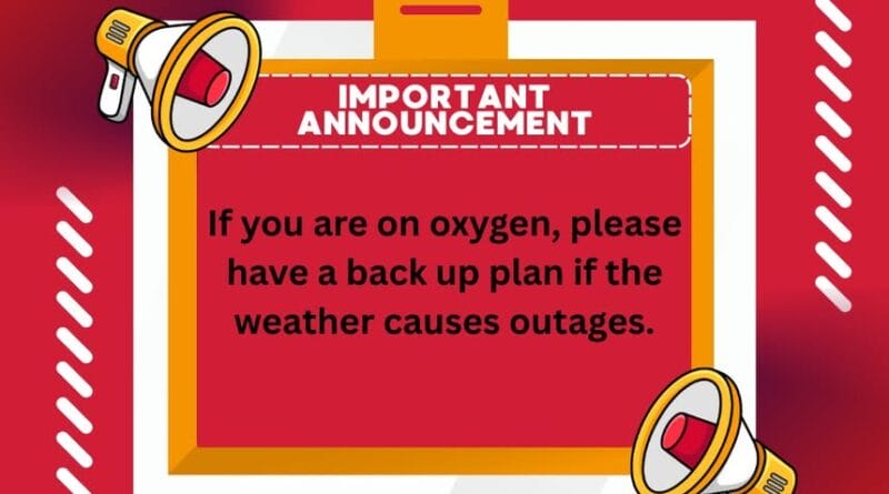 Residents are advised to prepare for possible power outages. Those on oxygen should consider stocking extra or portable tanks, and using battery backups where available.