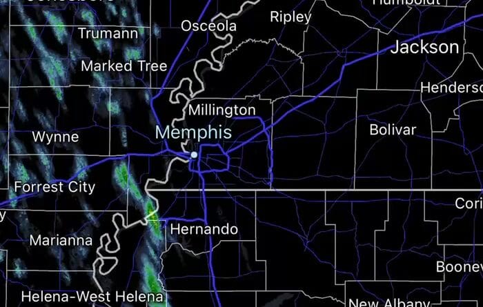 Snow flurries move across parts of Arkansas, Tennessee, and Mississippi