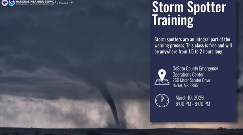 A storm spotter training class is scheduled for Tuesday at 6 p.m. in Nesbit, Mississippi, according to organizers.