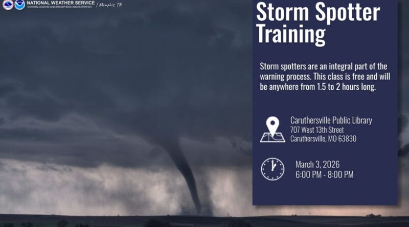 A storm spotter training class will be held Tuesday at 6 p.m. at the Caruthersville Public Library in Missouri, according to organizers.