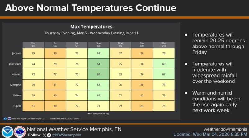 Memphis residents can expect a warm end to the week, with temperatures remaining well above normal, according to the National Weather Service in Memphis.
