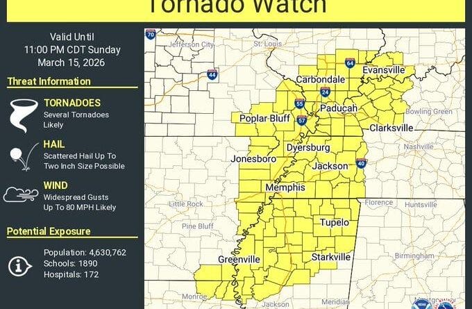 The National Weather Service in Memphis has issued a tornado watch for portions of Arkansas, Illinois, Indiana, Kentucky, Louisiana, Mississippi, Missouri, and Tennessee.