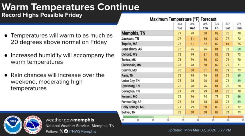 Temperatures are expected to remain warm throughout the week, according to weather forecasts. The region is experiencing above-average temperatures, with daytime highs in the normal range for late spring.
