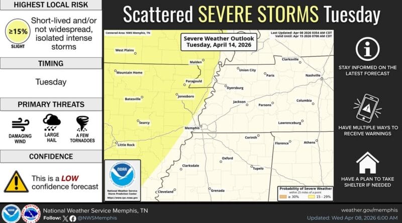 However, the National Weather Service has issued a Slight Risk (2 out of 5) for severe storms across areas west of the Mississippi River, indicating potential for severe weather next Tuesday.