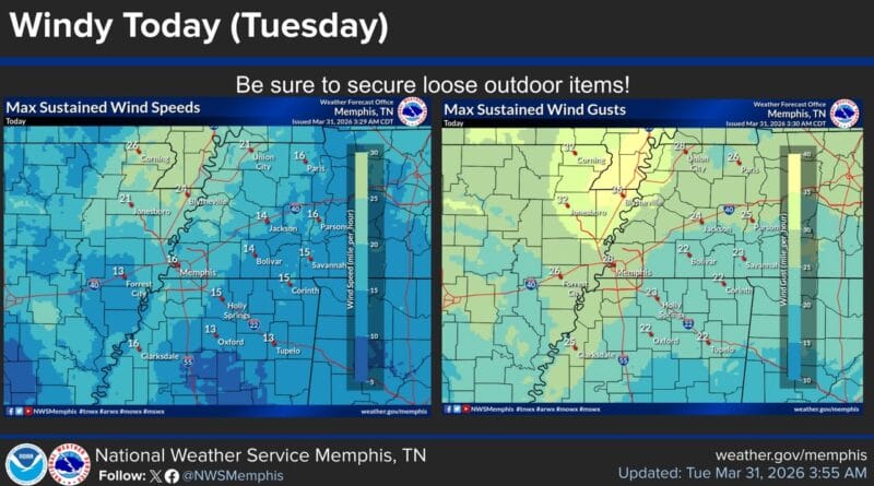 The National Weather Service in Memphis, Tennessee, forecasts a warm and windy spring day for the Mid-South region.