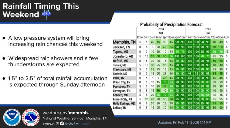 The National Weather Service in Memphis, Tennessee, has issued an updated forecast for weekend rainfall. Showers are expected to become widespread Saturday evening and continue through mid-morning Sunday, according to the agency.