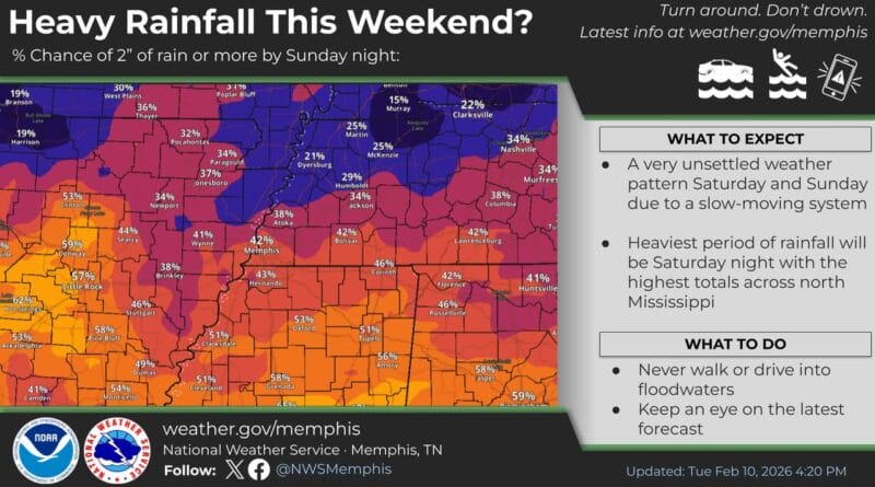 Forecasters say this weekend’s weather pattern is more likely to produce heavy rainfall than severe weather outbreaks. The exact amount of rain remains uncertain as models are still being analyzed.